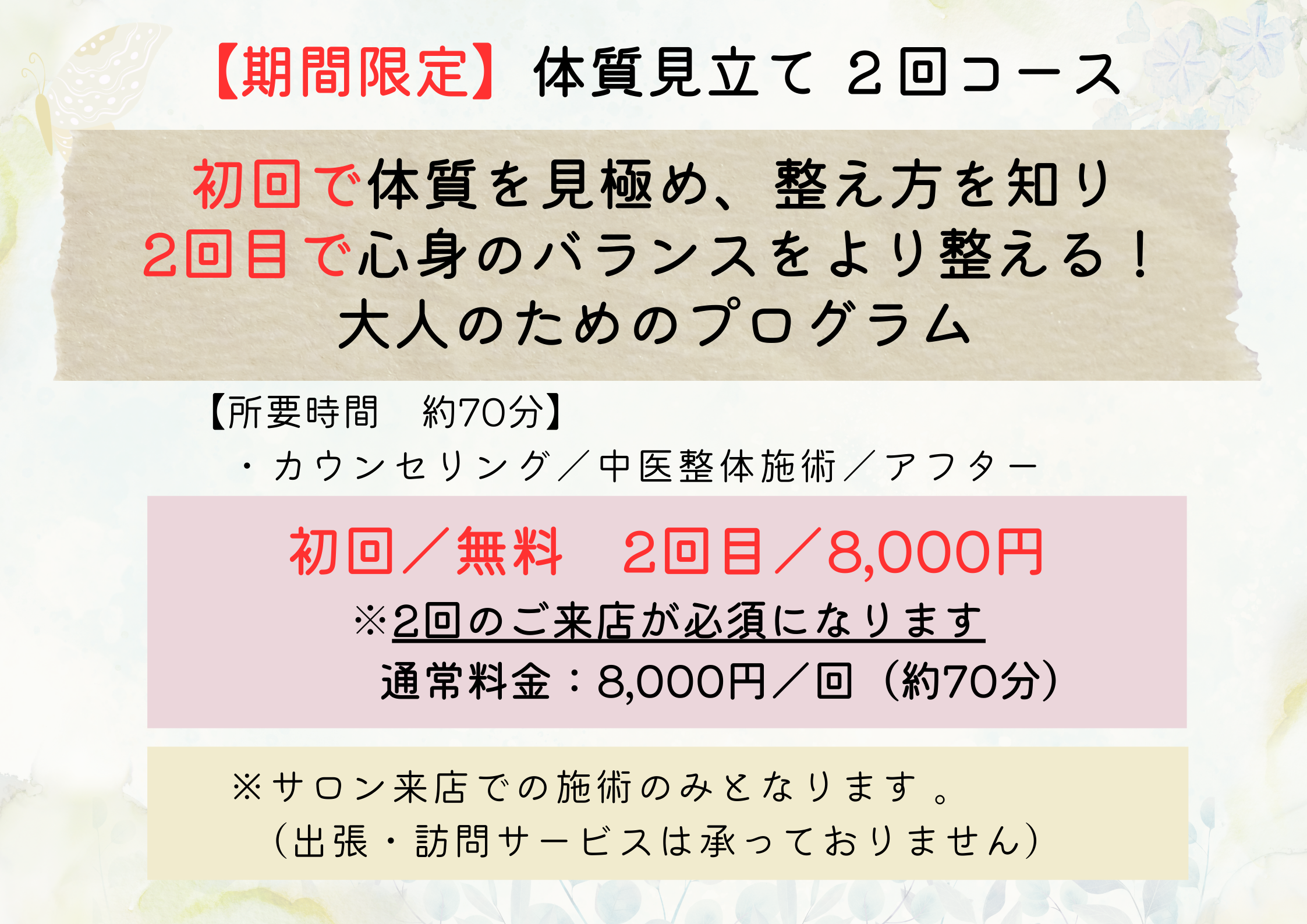 当サロンでは中国医学の理論をベースに、丁寧なカウンセリングを通してお一人おひとりの体質やリズムを見立て、心身の調和をサポートします。